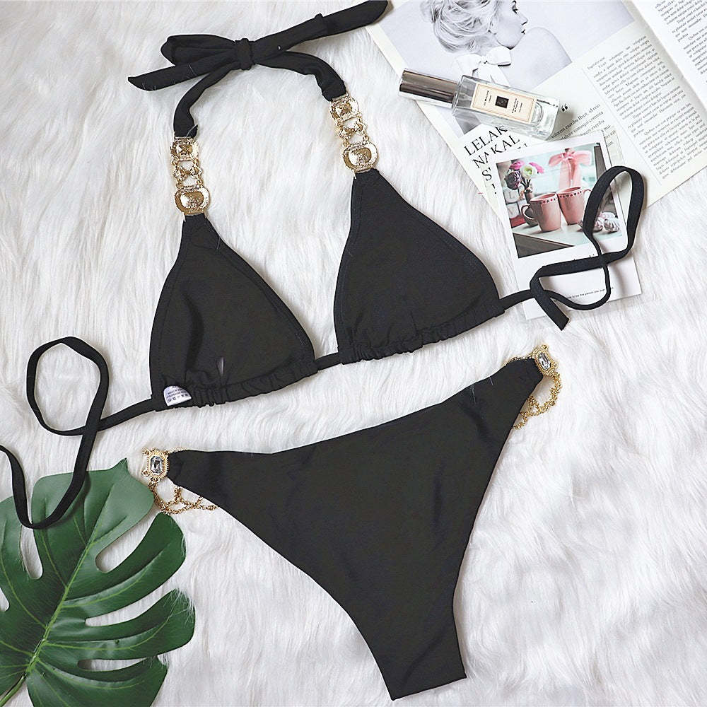 ブラジリアンビキニ ツーピース水着 セパレート 紐 tバック ホルターネック 背中開き 全6色 セクシー カップ付き ワイヤーなし パッド 大胸 ラインストーン サウナ 温泉 水泳 海水浴 プール S~L
