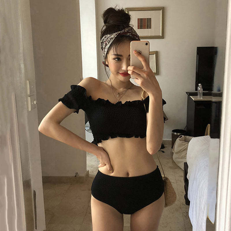ツーピース水着 ボートネック 着痩せ 盛れる フリル シンプル パッド M~XL